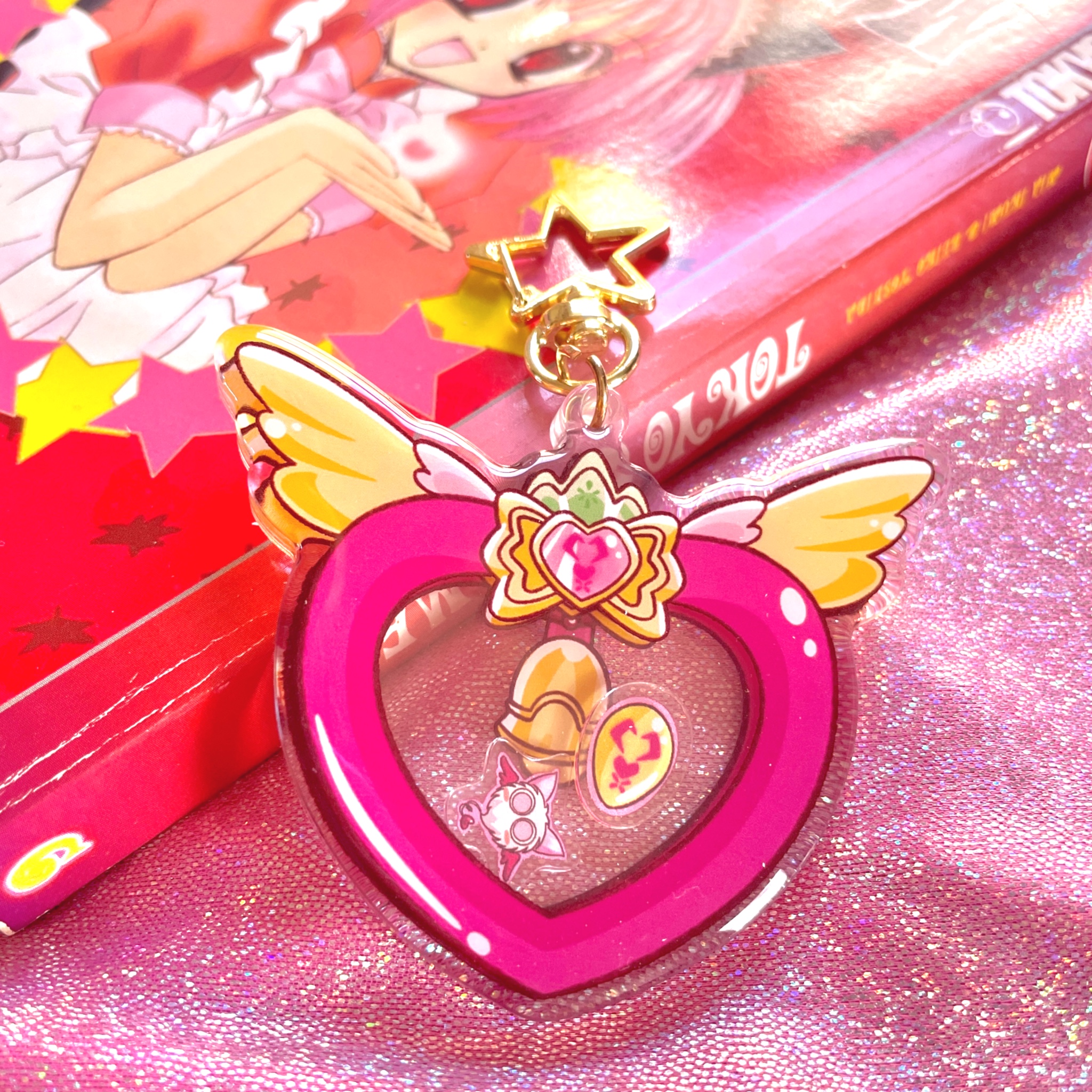 Mew Mew style, Mew Mew grace, Mew Mew power in your face! Become a Mew Mew with this acrylic shaker keychain featuring Ichigo's signature Strawberry Bell with little Masha and the Mew Mew Pendant as acrylic shaker pieces inside.