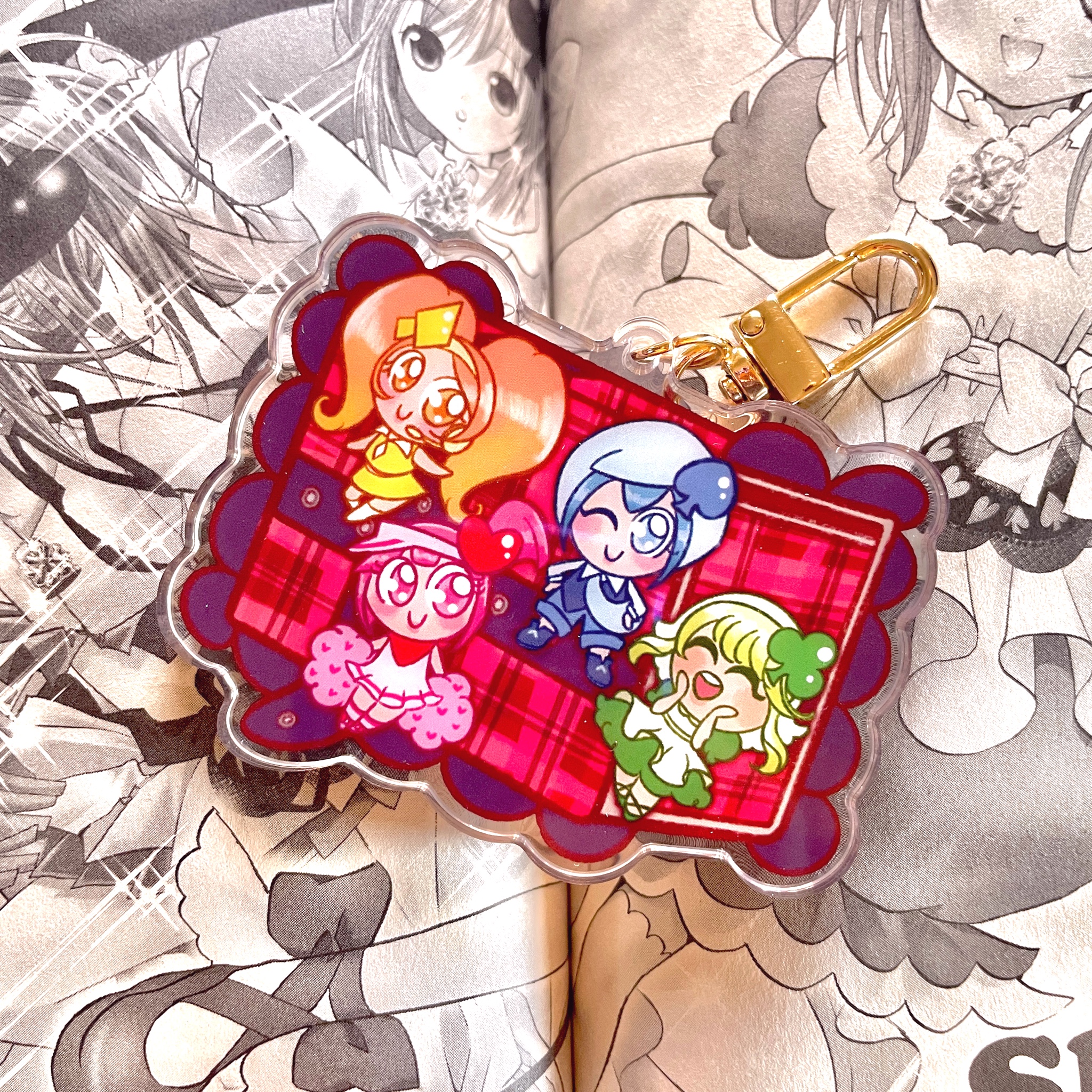 Your guardian characters, Ran, Miki, Su, and Dia are here to help you achieve your dreams with this acrylic shaker charm. It features Amu's signature fanny pack with her guardian eggs as acrylic shaker pieces and the guardian characters on the back.
