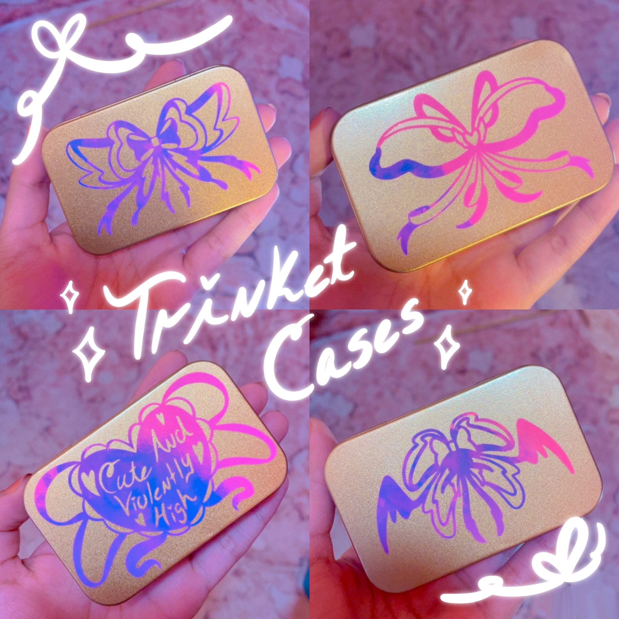 A special place to keep all your trinkets. Box measures at 3.7 x 2.3 x 0.8 Inch with printed decal on outside and inside box.