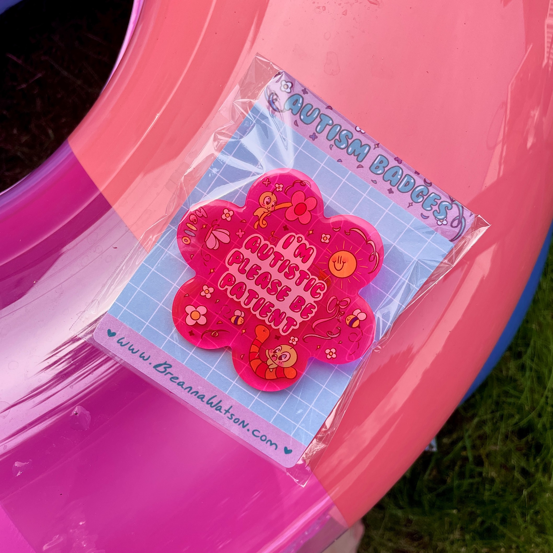 "I'm Autistic Please Be Patient" and "I Have ADHD Please Be Patient" badges are designed to promote understanding, patience, and visibility. Perfect for everyday wear, conventions, and public spaces! Comes in a clear pink, blue, or orange with a pin and clasp back so there are multiple ways to wear without damaging clothes or causing sensory overload.