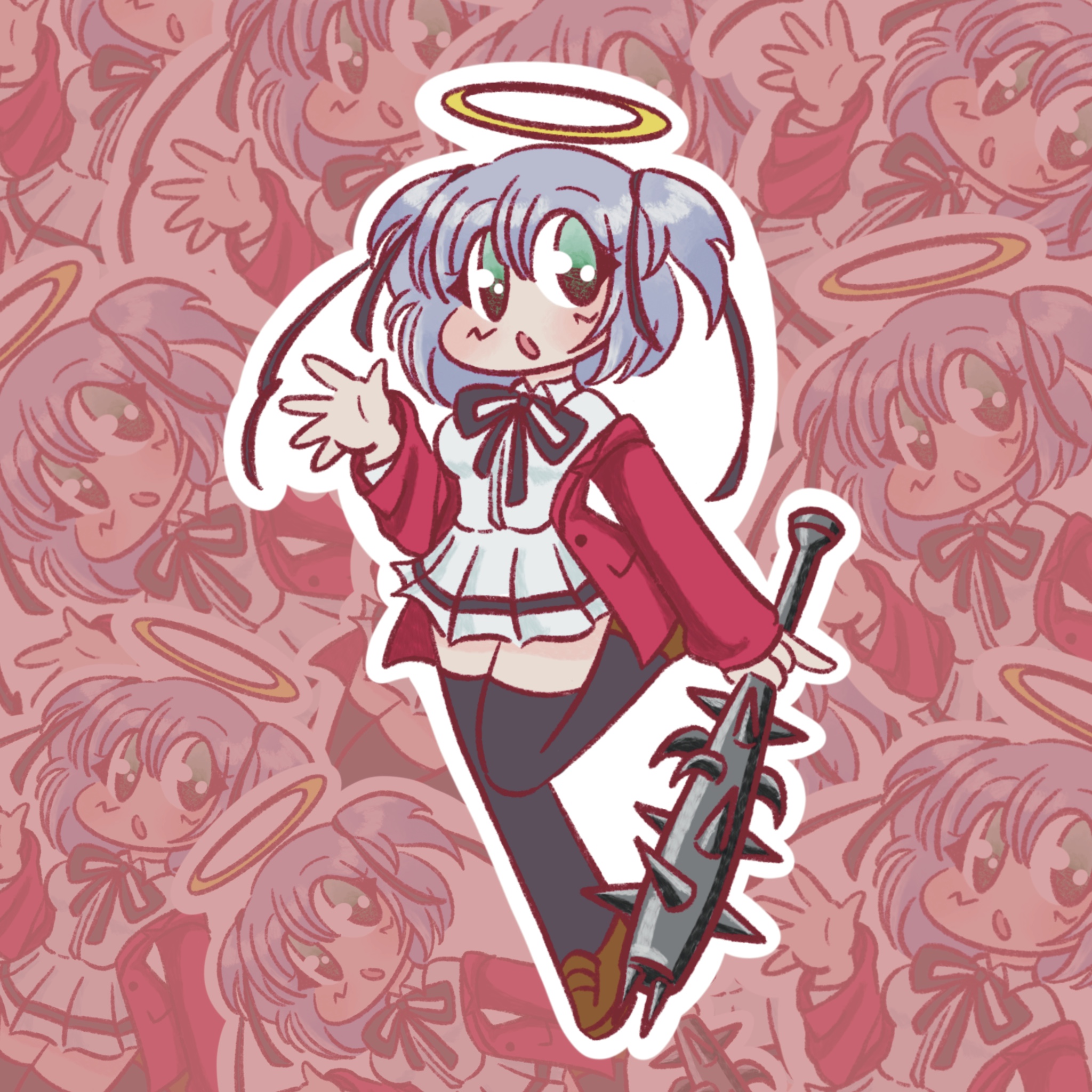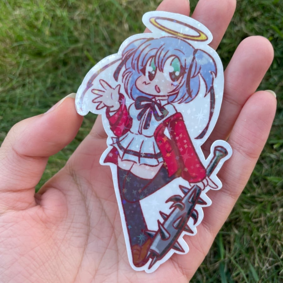 Pipiripiii~! This bludgeoning angel vinyl sticker is waterproof with a sparkly holo finish.