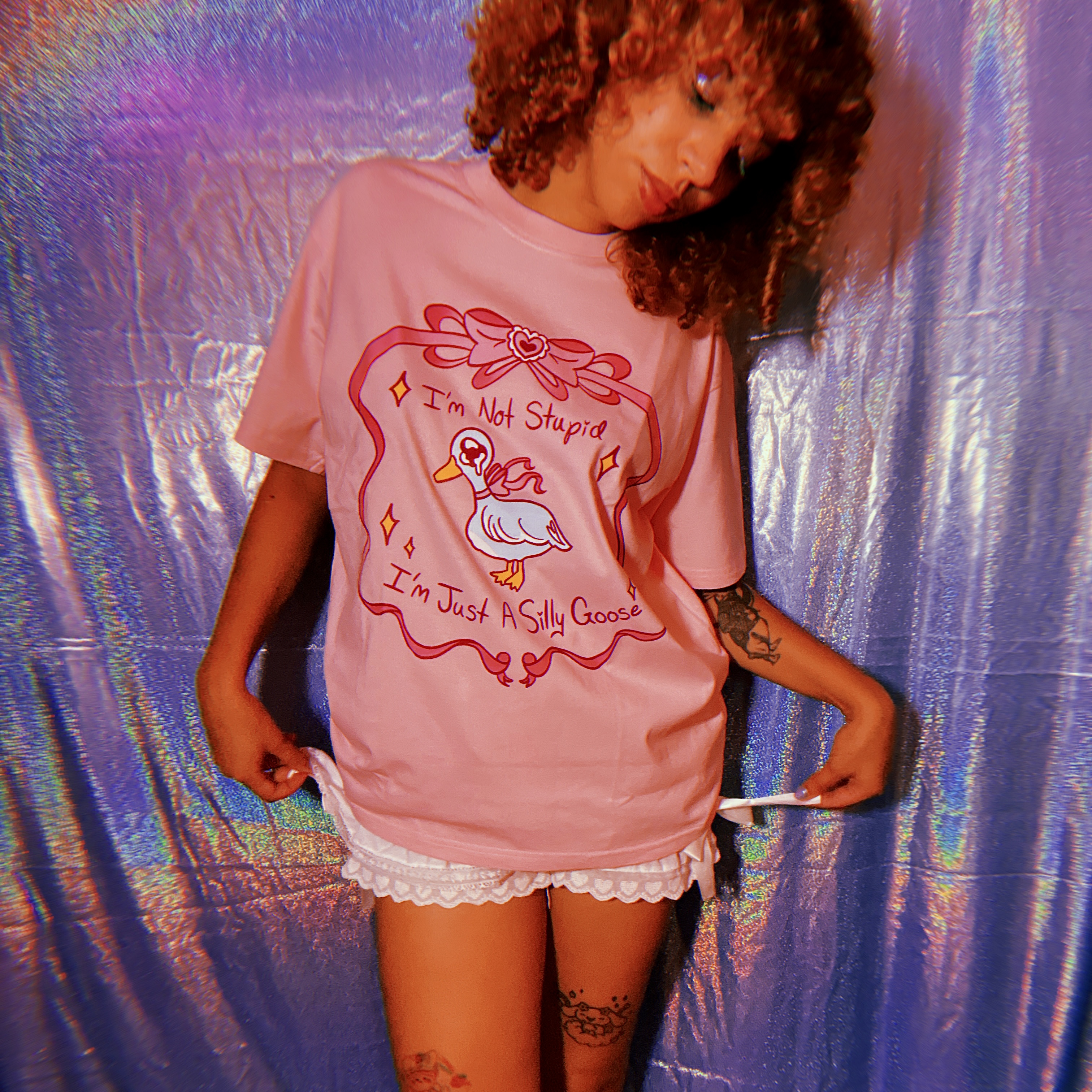 "I'm Not Stupid, I'm Just A Silly Goose" T-Shirt is the perfect shirt to show you're just a silly goose! This cotton t-shirt is a loose comfy fit in a light pastel pink with a ribbon printed on the back.