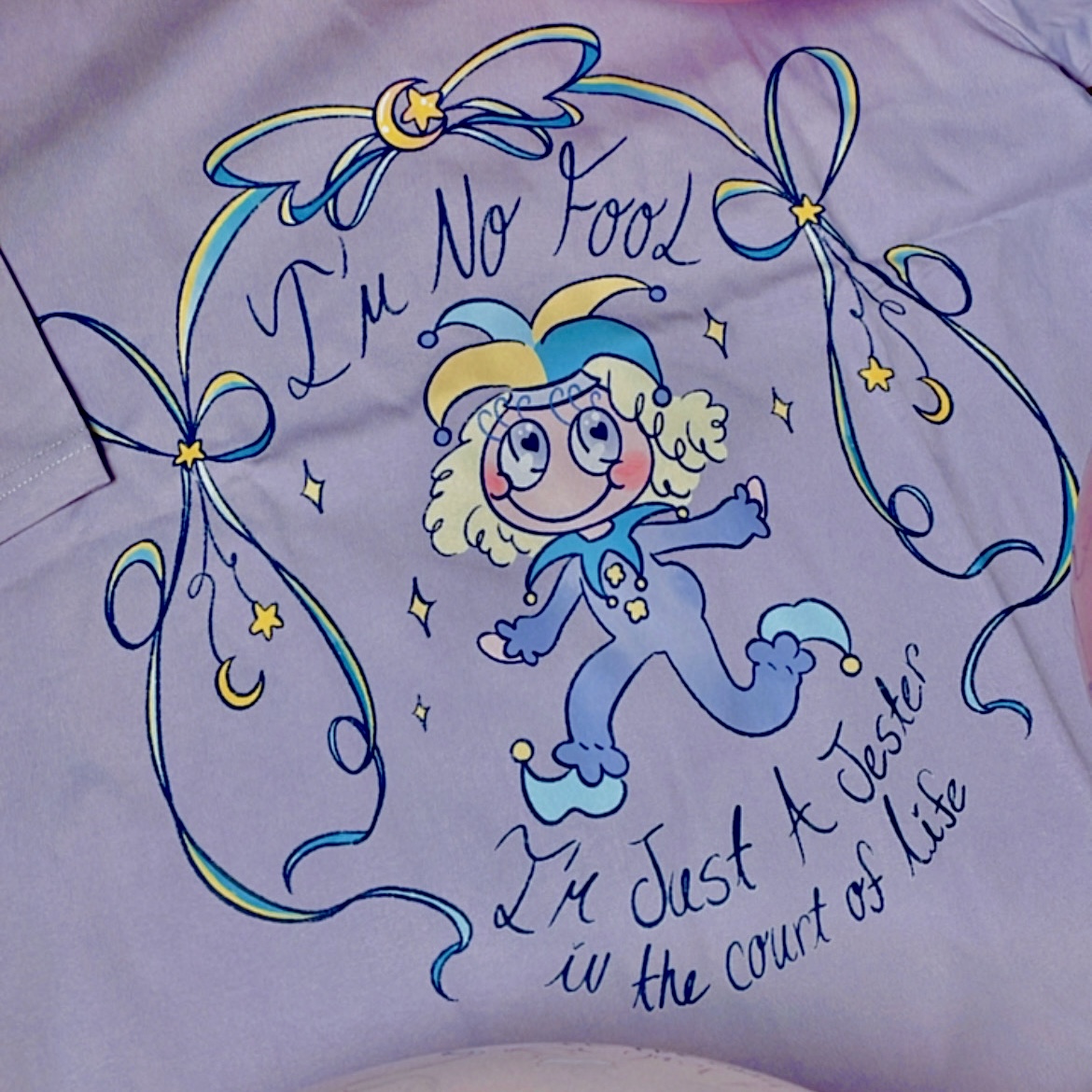 "I'm No Fool, I'm Just A Jester in the Court of Life" show everyone you're the cutest clown in court with this cotton t-shirt that comes in Lavender and has ribbons adorned on the sleeves.
